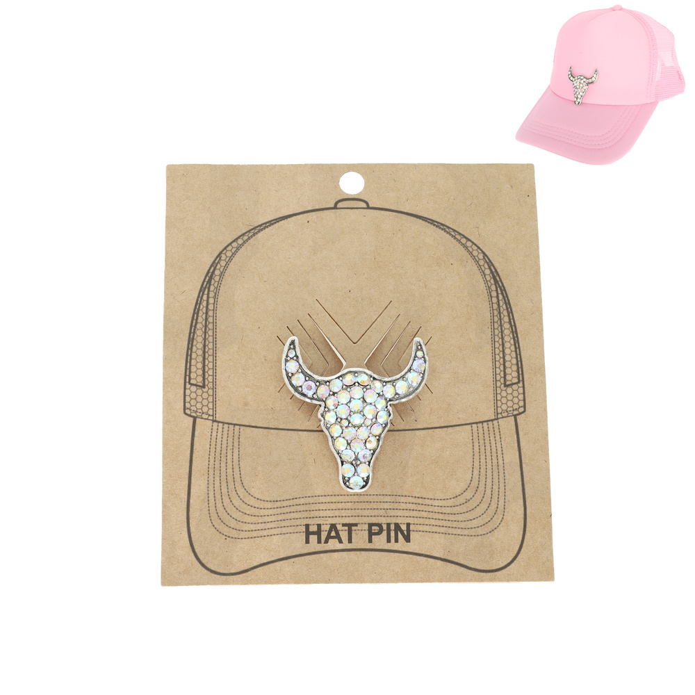 CRYSTAL CLUSTER COW SKULL HAT PIN IN OXIDIZED SILVER-TONE METAL
