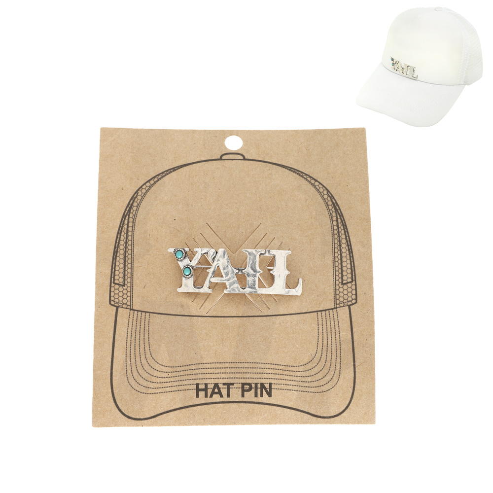TURQUOISE "YALL" HAT PIN IN OXIDIZED SILVER-TONE METAL