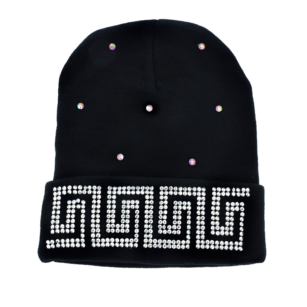 CRYSTAL RHINESTONE JEWELED STAR / QUEEN / CROSS / GREEK KEY SQUARE DESIGN PATTERN STUDDED CUFF KNIT BEANIE