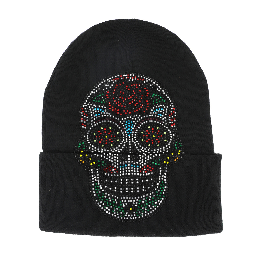 Day Of The Dead Assorted Sugar Skull Unisex Crystal Studded Knit Cuffed Stretchy Beanie Winter Hat