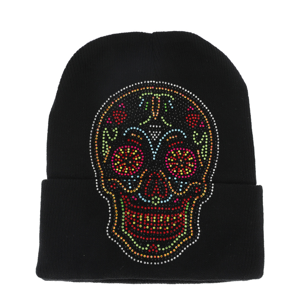 Day Of The Dead Assorted Sugar Skull Unisex Crystal Studded Knit Cuffed Stretchy Beanie Winter Hat