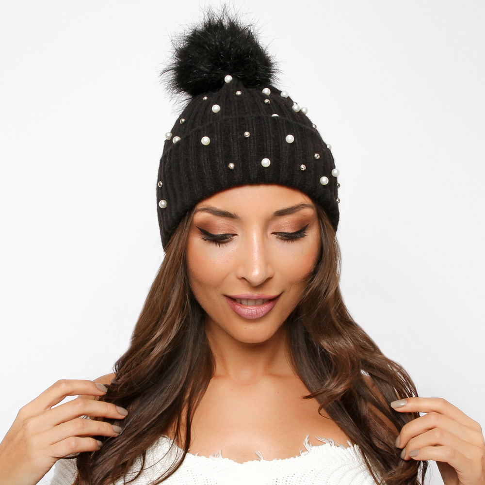 BEANIE W/ PEARLS & FAUX FUR POM POM