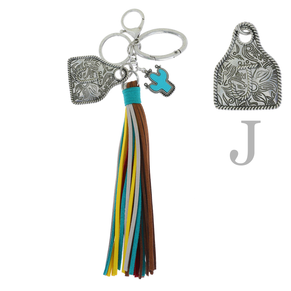 Western Monogram Initial Cow Tag Cactus Charm Multicolor Suede Tassel Key Ring