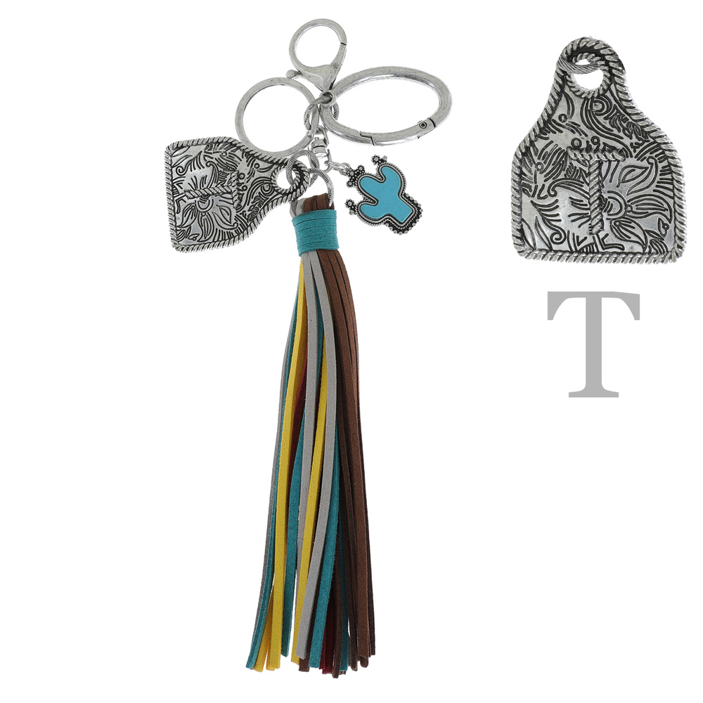 WESTERN MONOGRAM INITIAL COW TAG CACTUS CHARM MULTICOLOR SUEDE TASSEL KEY RING
