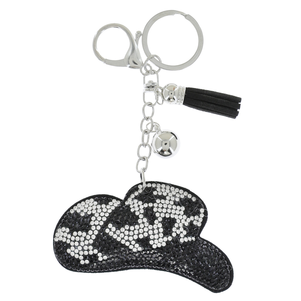 Crystal Rhinestone Pave Leopard Print Cowboy Hat Multi Charm Suede Fringe Keychain With Dual Split Ring And Lobster Claw Clasp