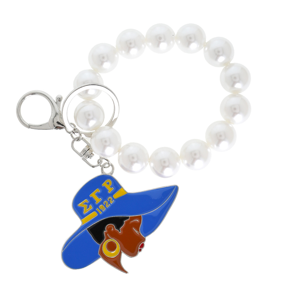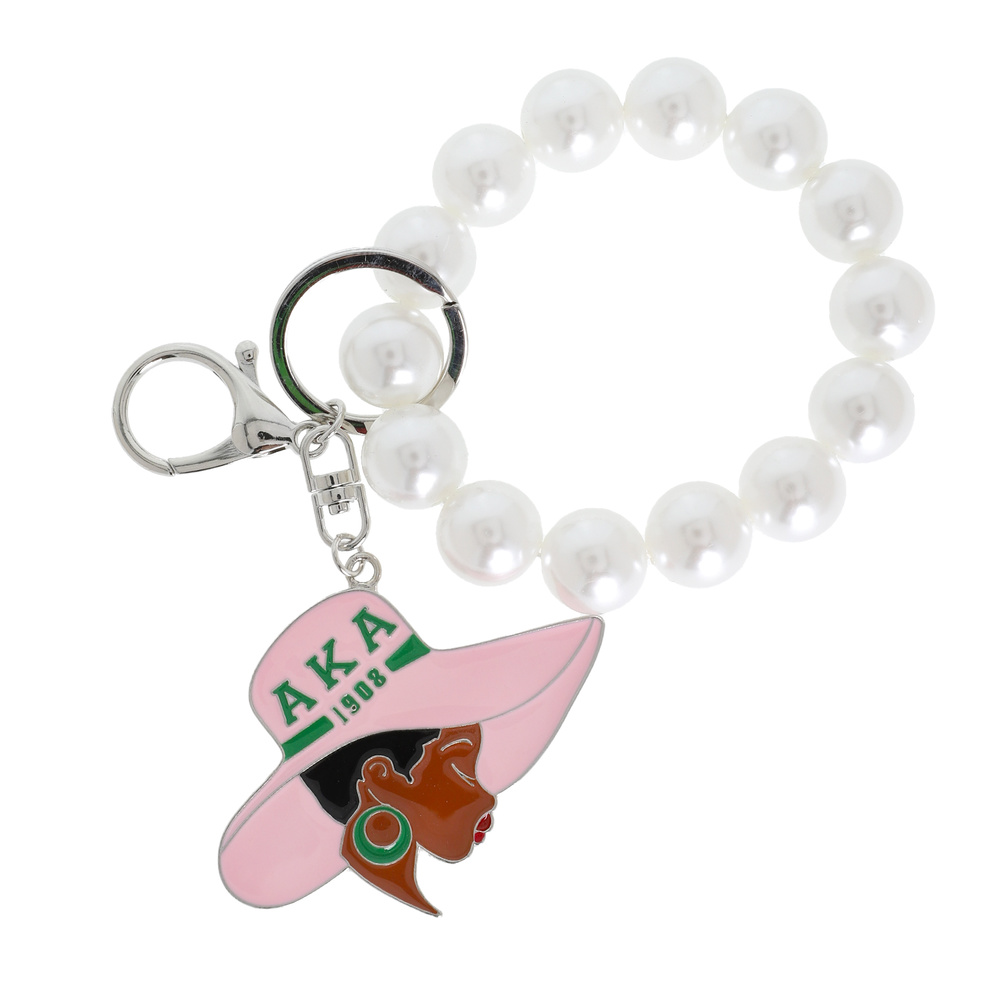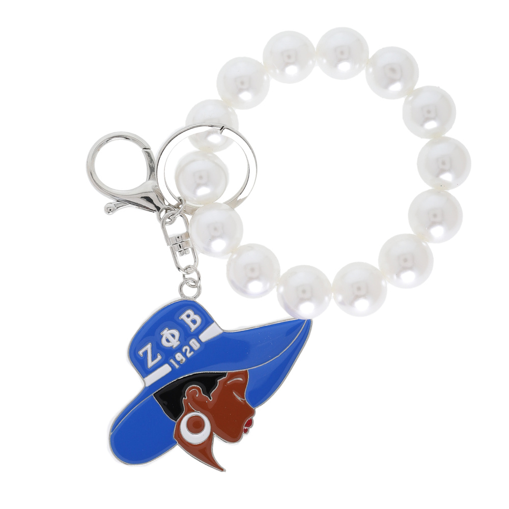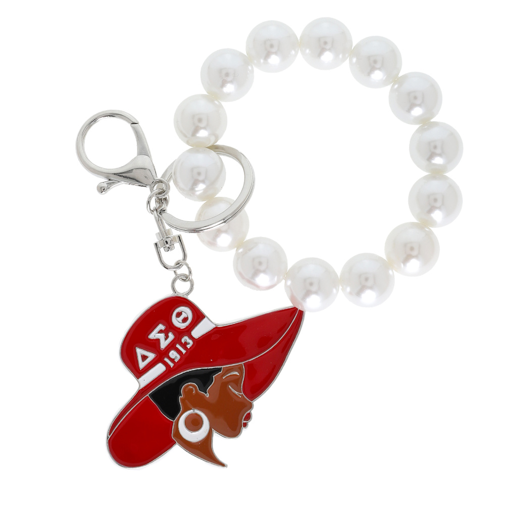 ZETA PHI BETA/ALPHA KAPPA ALPHA/ DELTA SIGMA THETA/ SIGMA GAMMA RHO / AFROCENTRIC SORORITY SOUTHERN STYLE AFRICAN AMERICAN LADY ENAMEL COATED PEARL BEADED STRETCH BRACELET CHARM KEYCHAIN WITH DUAL SPLIT RING AND LOBSTER CLAW CLASP