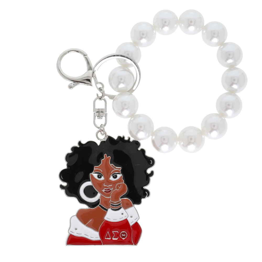 ALPHA KAPPA ALPHA/ DELTA SIGMA THETA -AFROCENTRIC SORORITY COLLEGIATE DIVA ENAMEL COATED PEARL BEADED STRETCH BRACELET CHARM KEYCHAIN WITH DUAL SPLIT RING AND LOBSTER CLAW CLASP