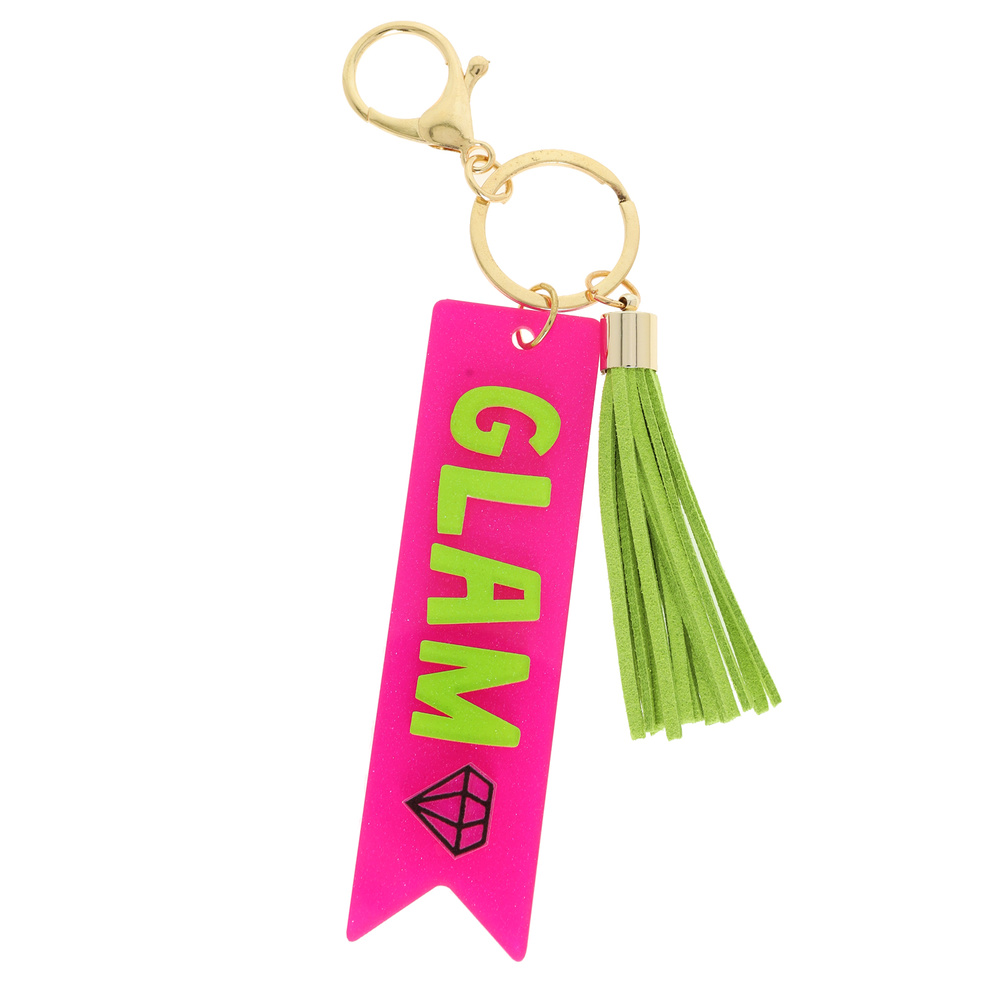 "GLAM" DIAMOND PRINT LONG STRIP LETTERING GLITTER ACETATE SUEDE FRINGE CHARM KEYCHAIN WITH DUAL SPLIT RING AND LOBSTER CLAW CLASP IN GOLD TONE METAL
