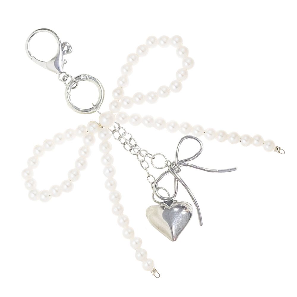 PEARL EMBELLISHED BOWKNOT AND HEART KEYCHAIN WITH SPLIT RING LOBSTER CLASP