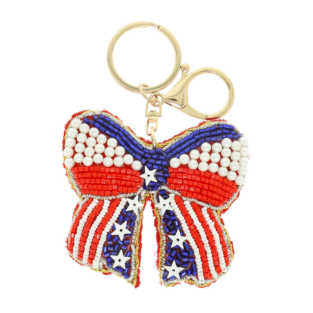 USA FLAG THEMED SEQUINS PEARL SEED BEADED BOW KEYCHAIN WITH SPLIT RING AND LOBSTER CLASP