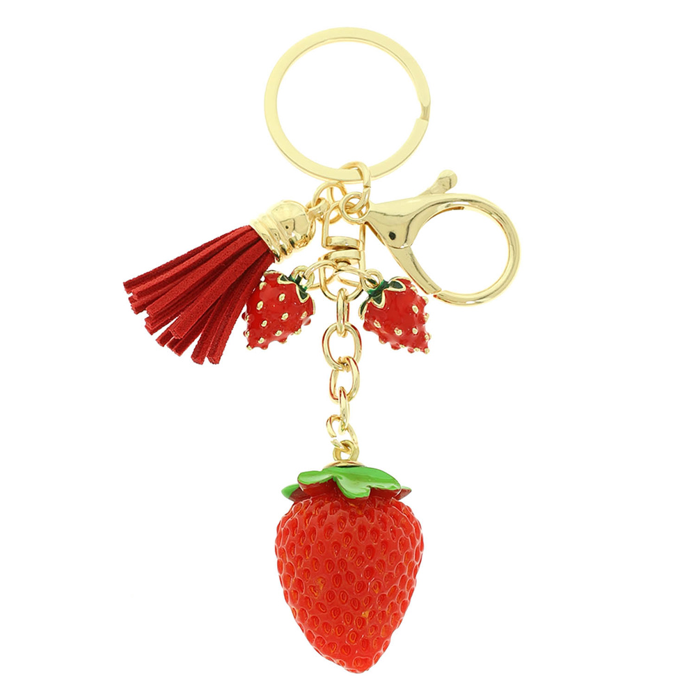 BERRY THEME BAG CHARM KEYCHAIN WITH ENAMEL STRAWBERRIES AND RED SUEDE TASSEL TRINKETS