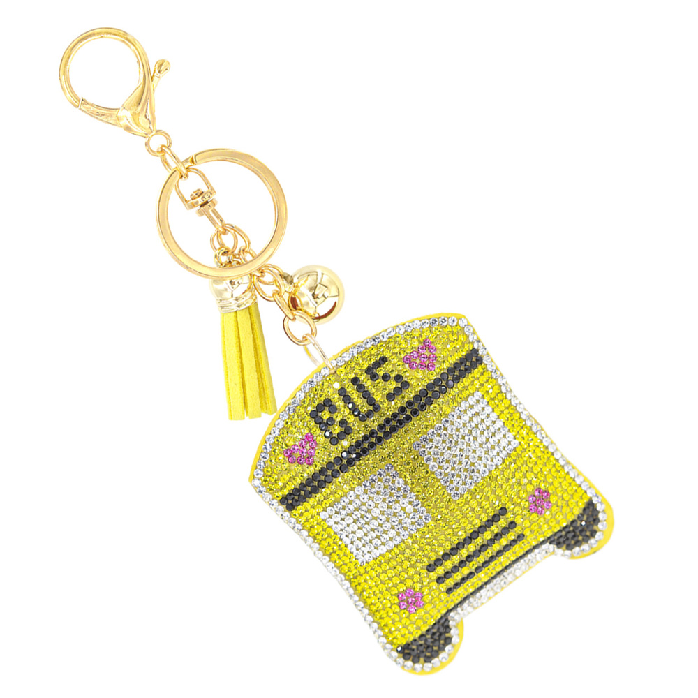 RHINESTONE PAVE YELLOW SCHOOL BUS BAG CHARM WITH TASSEL DUAL SPLIT RING AND LOBSTER CLASP