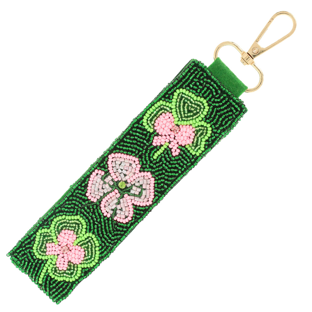 ST PATRICKS 4 LEAF CLOVER SEED BEAD WRISTLET KEYCHAIN WITH CRYSTAL ACCENTS