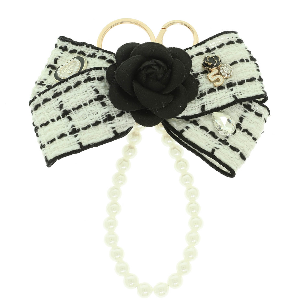 TWEED BOW BAG CHARM KEYCHAIN WITH CAMELLIA FLOWER PEARL LOOP AND CRYSTAL ACCENTS