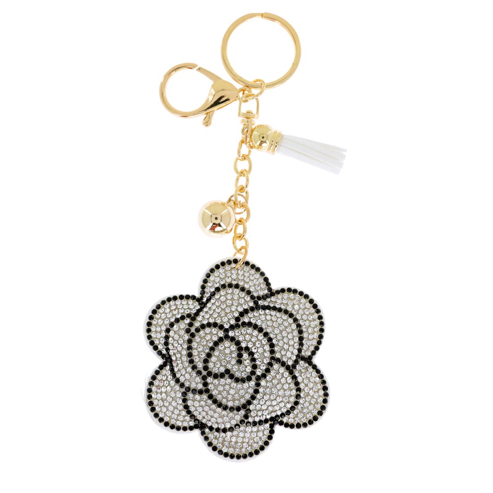 Crystal Rhinestone Pave Rose Multi Charm Suede Fringe Keychain With Dual Split Ring And Lobster Claw Clasp