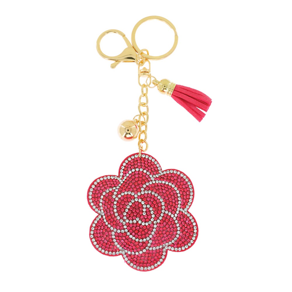 CRYSTAL RHINESTONE PAVE ROSE MULTI CHARM SUEDE FRINGE KEYCHAIN WITH DUAL SPLIT RING AND LOBSTER CLAW CLASP