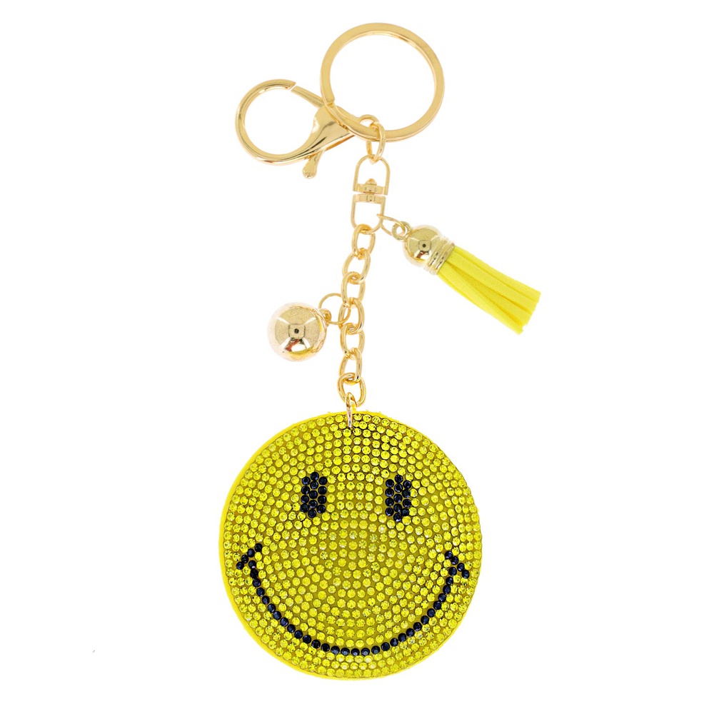 Crystal Rhinestone Pave Smiley Face Multi Charm Suede Fringe Keychain With Dual Split Ring And Lobster Claw Clasp