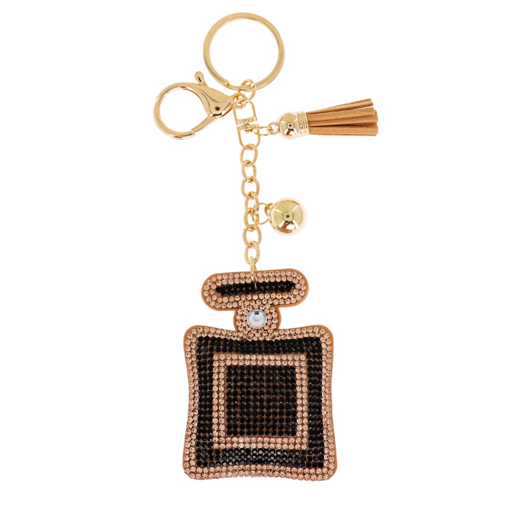 Crystal Rhinestone Pave Perfume Bottle Multi Charm Suede Fringe Keychain With Dual Split Ring And Lobster Claw Clasp