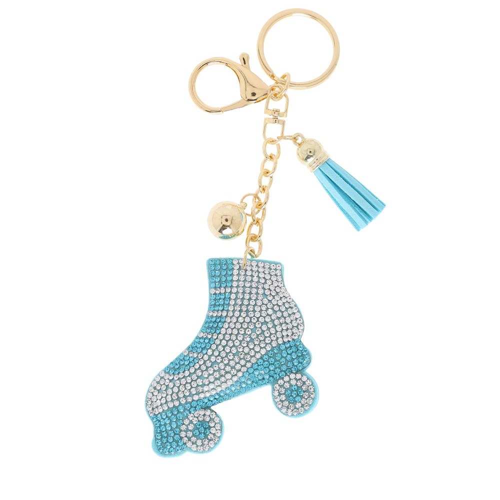 Two-tone Crystal Rhinestone Pave Multi Charm Suede Fringe Retro Roller Skates Keychain With Dual Split Ring And Lobster Claw Cla