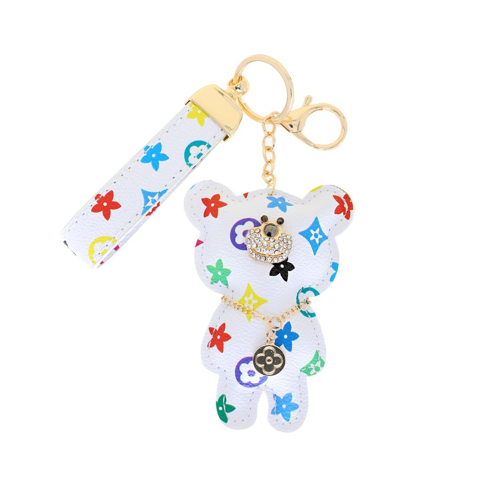 Multicolor Pattern Faux Leather Luxury Teddy Bear Wristlet Keychain