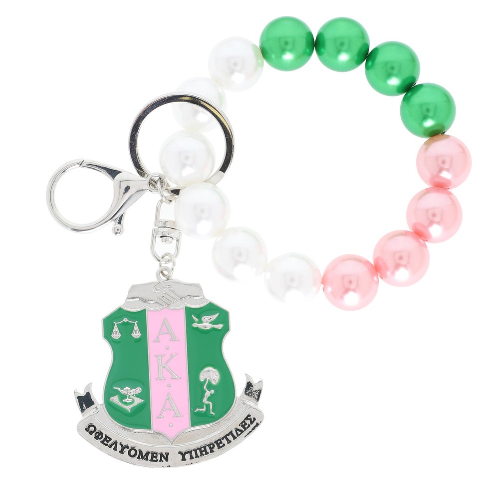 ALPHA KAPPA ALPHA GREEK SORORITY CREST ENAMEL COATED PEARL BEADED STRETCH CHARM BRACELET KEYCHAIN WITH DUAL SPLIT RING AND LOBSTER CLAW CLASP
