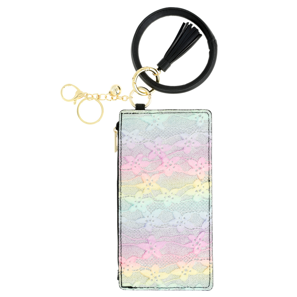 RAINBOW COLOR FLORAL LACE ZIPPER PURSE WITH WRISTLET AND KEYCHAIN