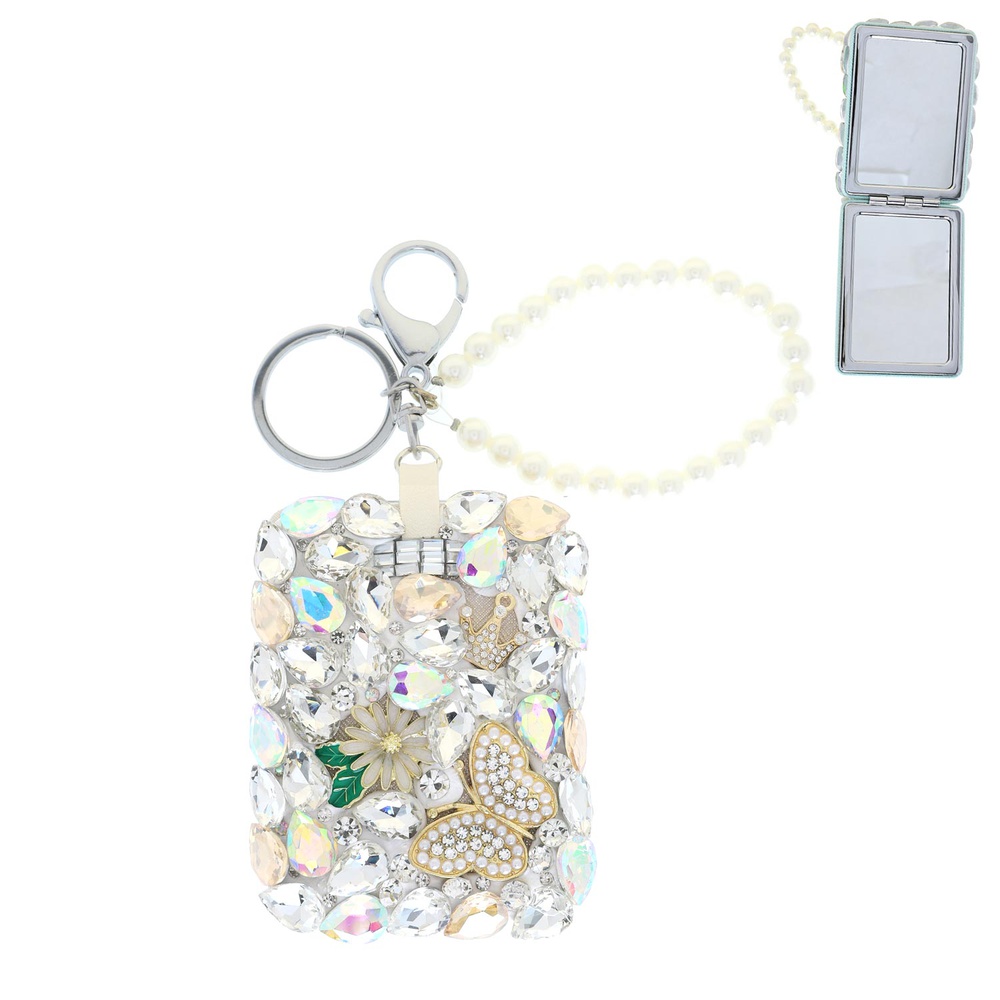 RECTANGULAR JEWELED CRYSTAL RHINESTONE COMPACT MIRROR PEARL BRACELET WRISTLET KEYCHAIN WITH DUAL SPLIT RING AND LOBSTER CLAW CLASP