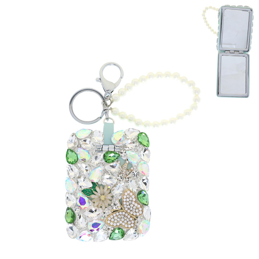 RECTANGULAR JEWELED CRYSTAL RHINESTONE COMPACT MIRROR PEARL BRACELET WRISTLET KEYCHAIN WITH DUAL SPLIT RING AND LOBSTER CLAW CLASP