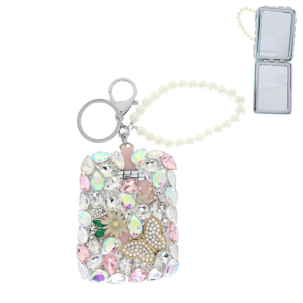 RECTANGULAR JEWELED CRYSTAL RHINESTONE COMPACT MIRROR PEARL BRACELET WRISTLET KEYCHAIN WITH DUAL SPLIT RING AND LOBSTER CLAW CLASP