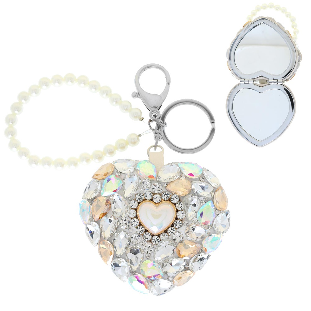 HEART SHAPED JEWELED CRYSTAL RHINESTONE COMPACT PEARL BRACELET WRISTLET KEYCHAIN WITH DUAL SPLIT RING AND LOBSTER CLAW CLASP