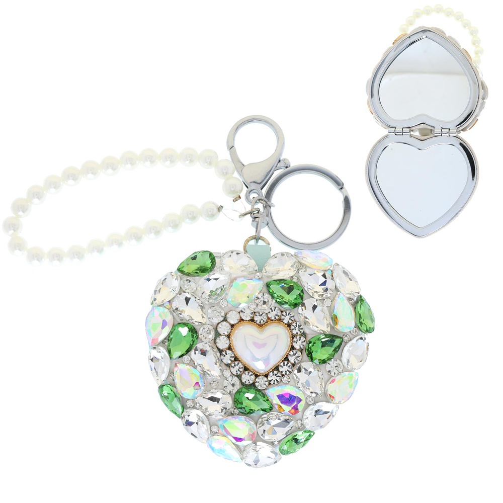 HEART SHAPED JEWELED CRYSTAL RHINESTONE COMPACT PEARL BRACELET WRISTLET KEYCHAIN WITH DUAL SPLIT RING AND LOBSTER CLAW CLASP