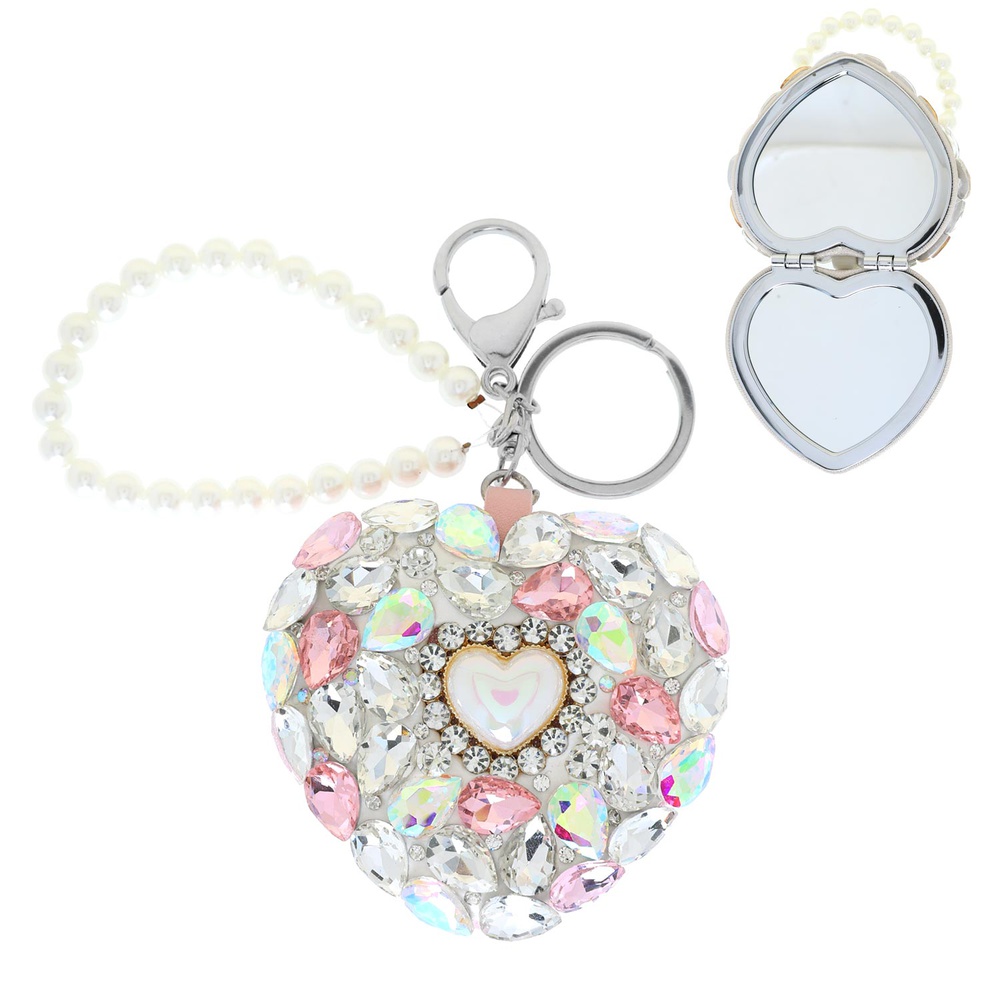 HEART SHAPED JEWELED CRYSTAL RHINESTONE COMPACT PEARL BRACELET WRISTLET KEYCHAIN WITH DUAL SPLIT RING AND LOBSTER CLAW CLASP