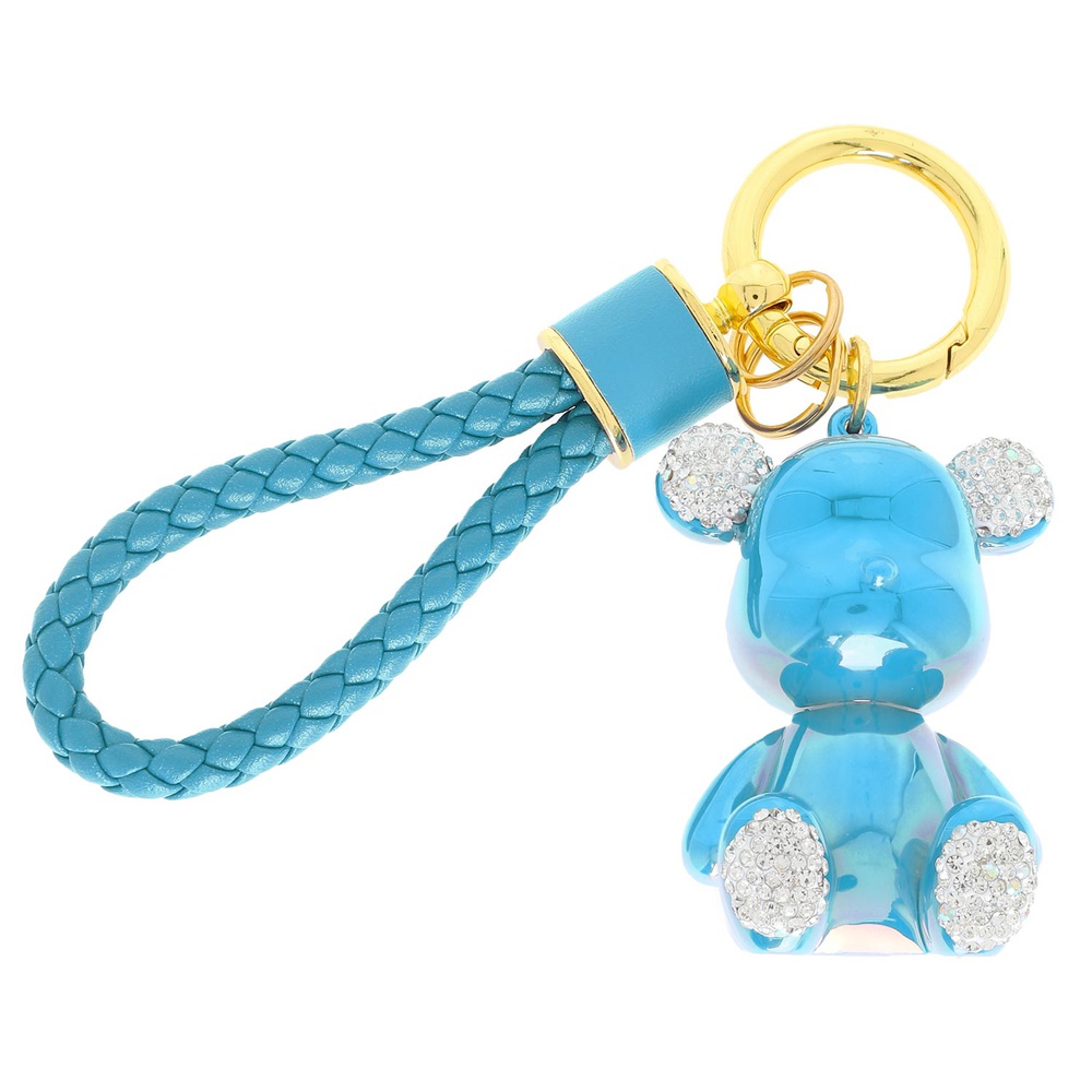 CRYSTAL RHINESTONE PAVE TEDDY BEAR SYNTHETIC LEATHER ROPE WRISTLET KEYCHAIN WITH DUAL SPLIT RING AND LOBSTER CLAW CLASP
