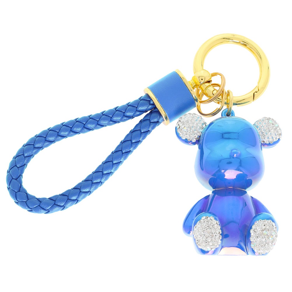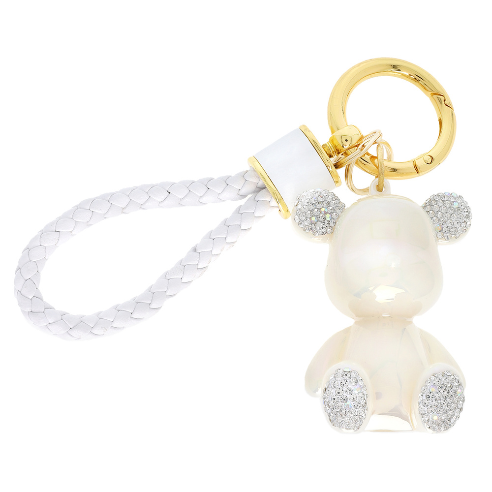 CRYSTAL RHINESTONE PAVE TEDDY BEAR SYNTHETIC LEATHER ROPE WRISTLET KEYCHAIN WITH DUAL SPLIT RING AND LOBSTER CLAW CLASP