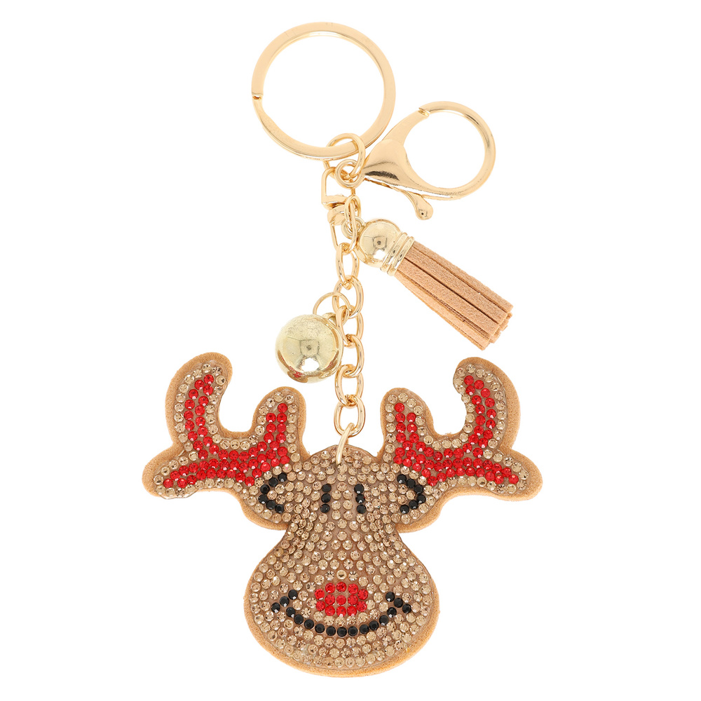 RHINESTONE RED NOSED REINDEER KEYCHAIN WITH BELL TASSEL SPLIT RING AND LOBSTER CLASP
