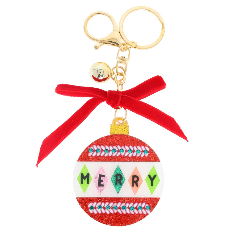 "MERRY" CHRISTMAS TREE ORNAMENT GLITTER ACETATE CRYSTAL RHINESTONE PAVE MULTI CHARM JINGLE BELL RIBBON KEYCHAIN WITH DUAL SPLIT RING AND LOBSTER CLAW CLASP