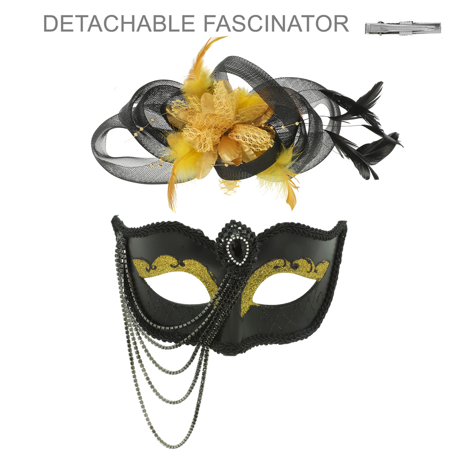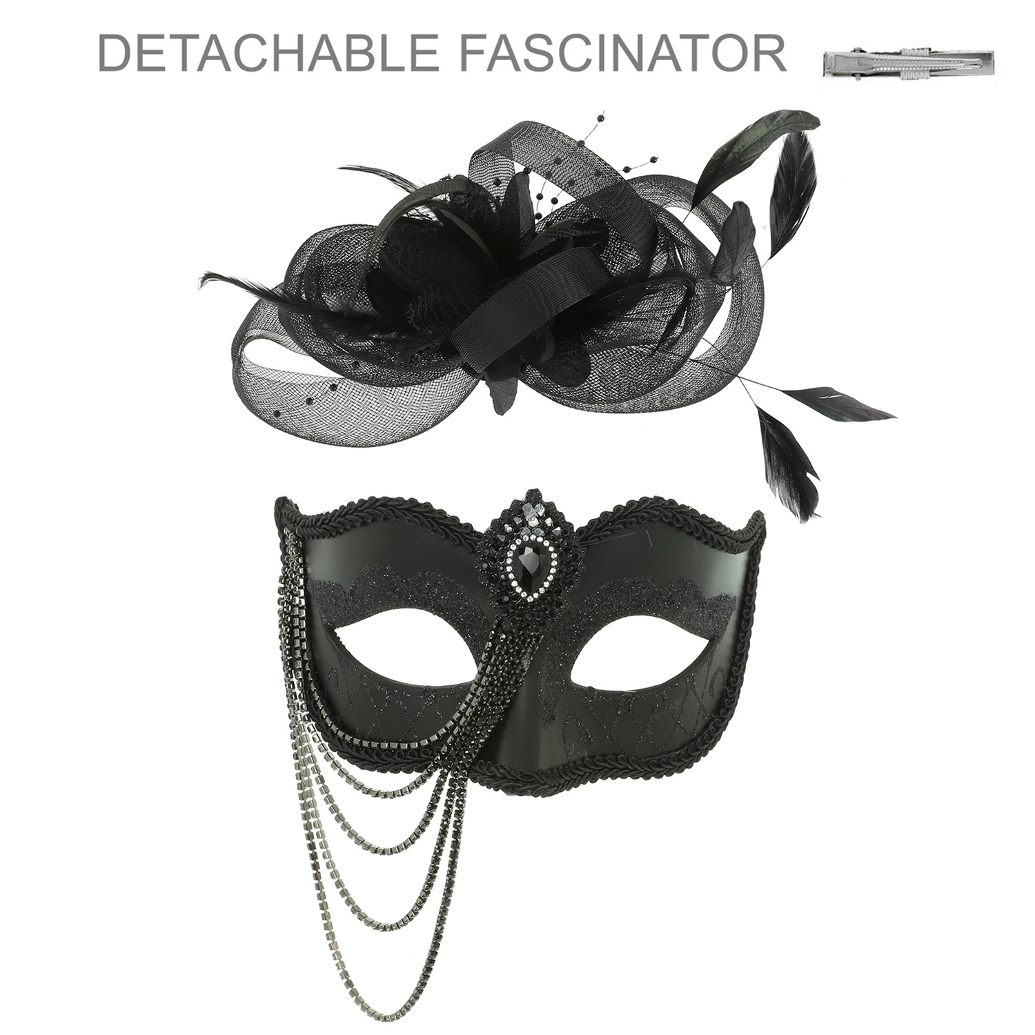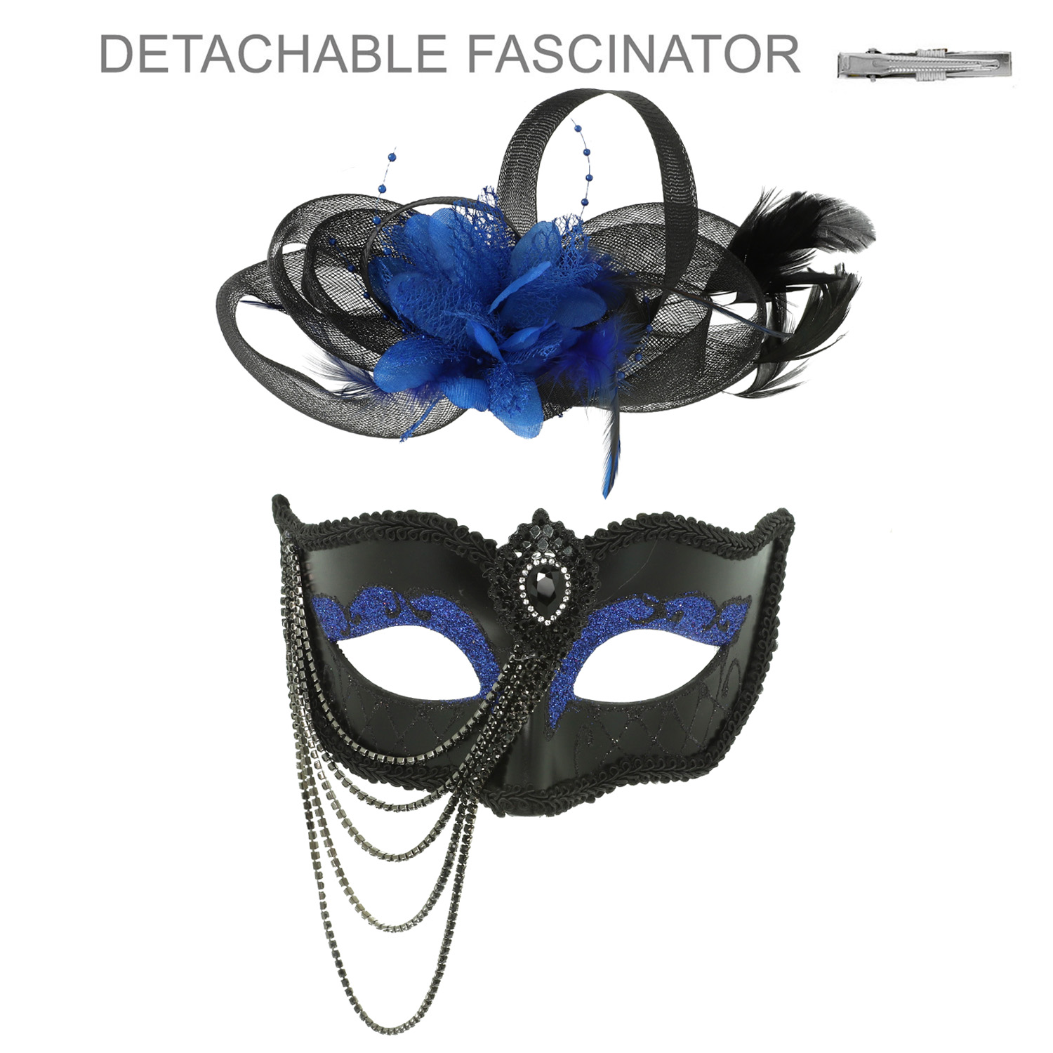 MASQUERADE MASK WITH COLOR FASCINATOR AND DRAPED CRYSTAL CHAIN ACCENTS