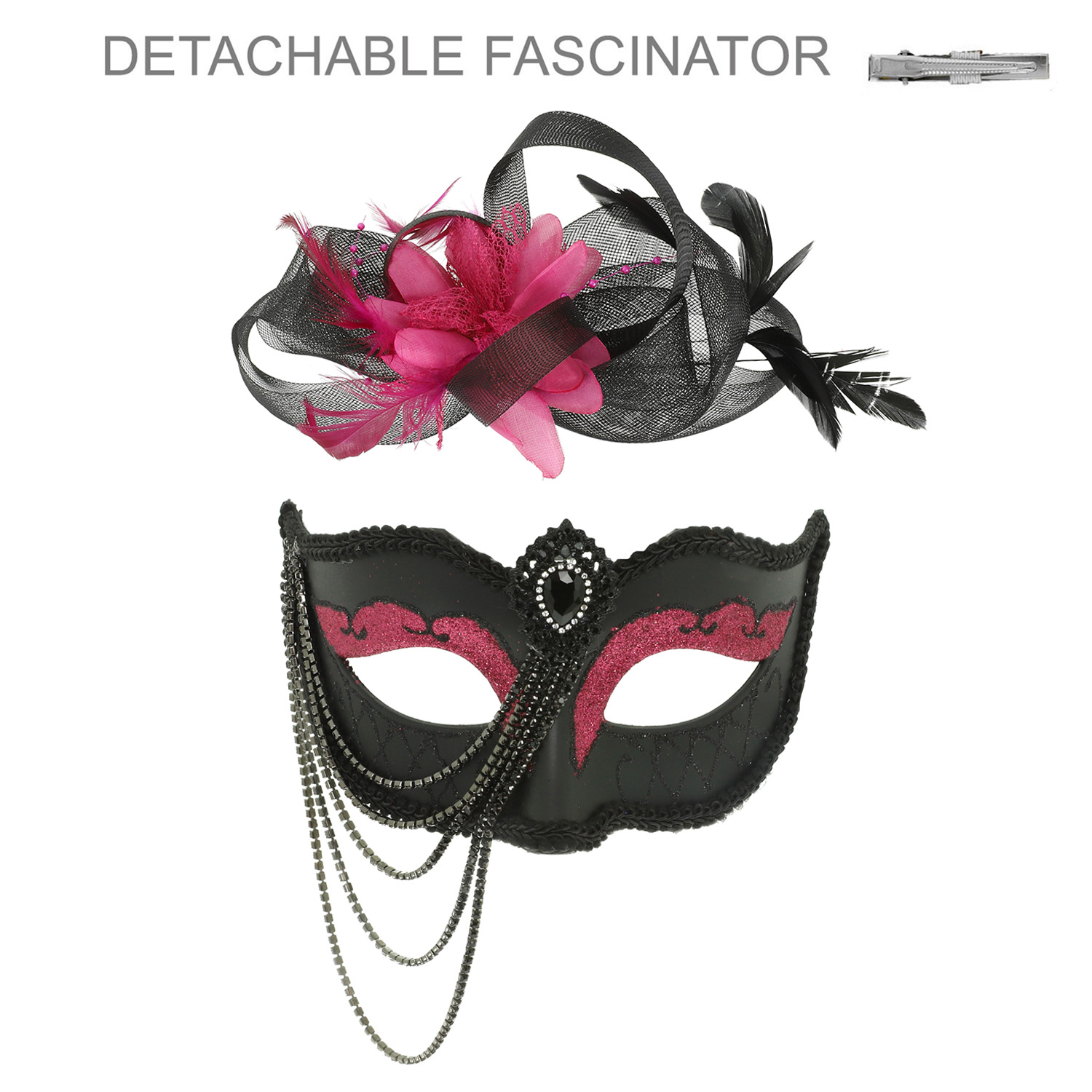 MASQUERADE MASK WITH COLOR FASCINATOR AND DRAPED CRYSTAL CHAIN ACCENTS