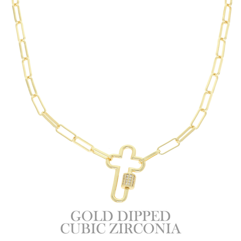 CUBIC ZIRCONIA PAVE CUTOUT CROSS PENDANT NECKLACE IN YELLOW GOLD PLATING