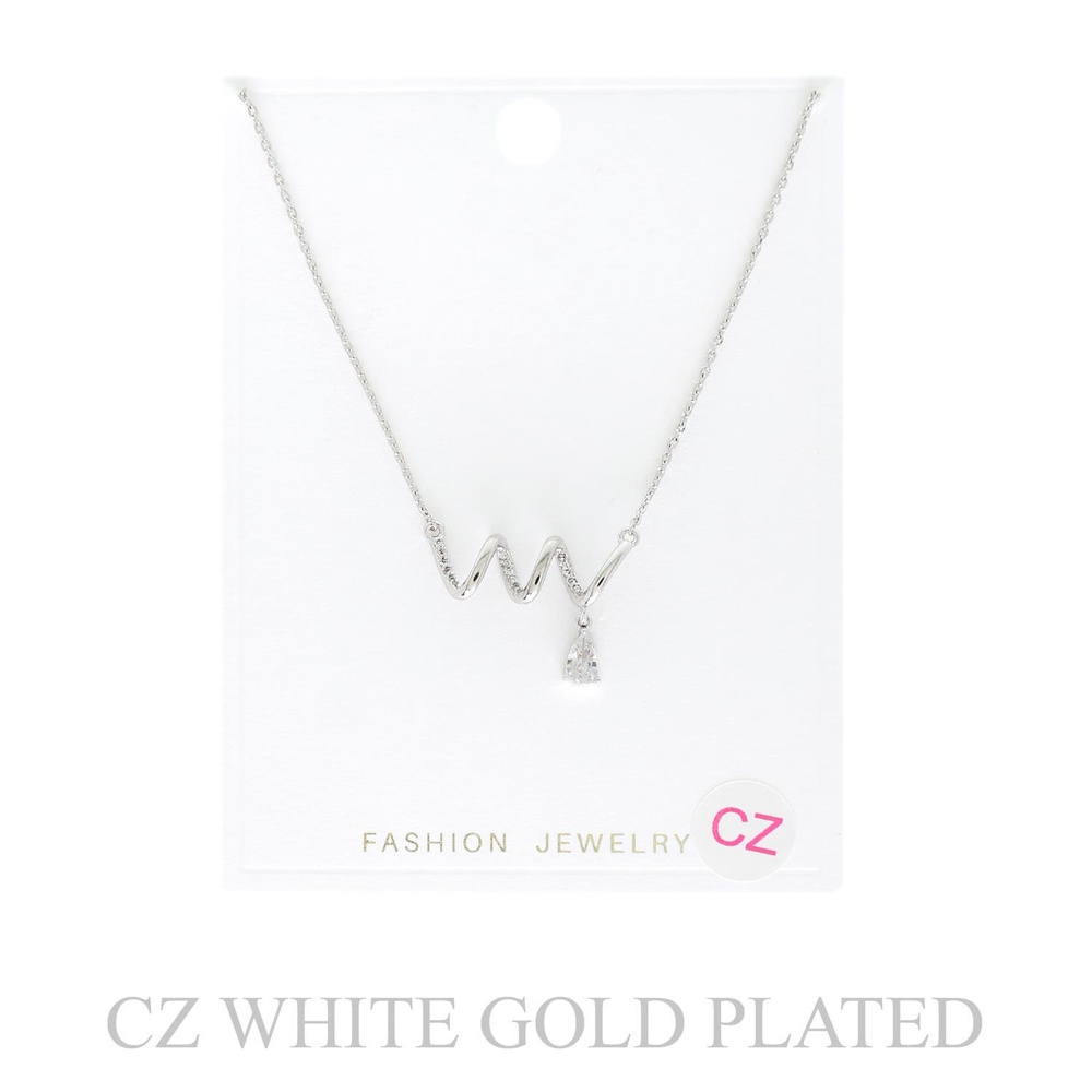 GOLD PLATED CUBIC ZIRCONIA ADJUSTABLE ZIG ZAG HEARTBEAT PENDANT CHAIN NECKLACE WITH DANGLING TEARDROP GEMSTONE IN WHITE GOLD PLATTING