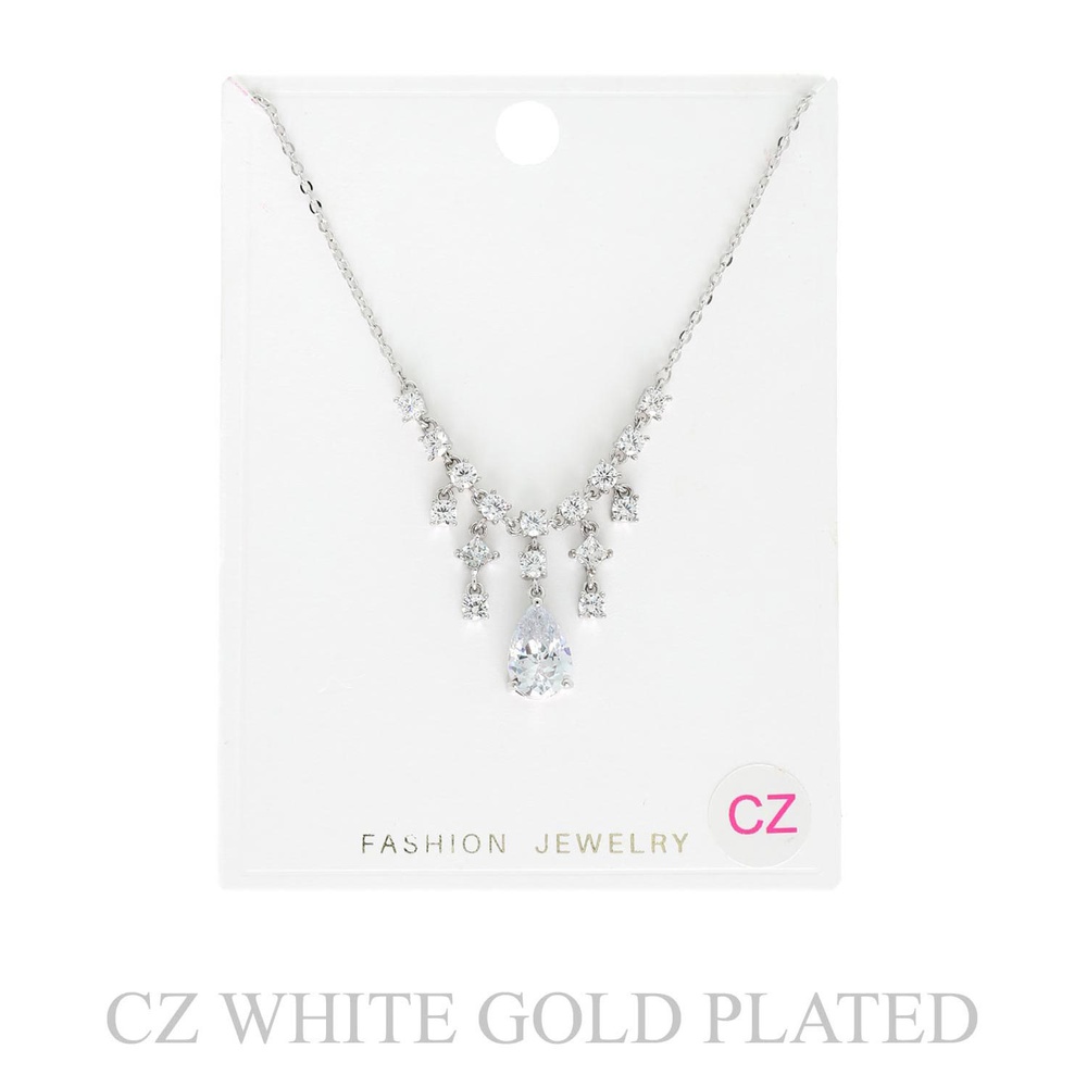 GOLD PLATED CUBIC ZIRCONIA GEMSTONE TEARDROP FRINGE ADJUSTABLE CHAIN NECKLACE IN WHITE GOLD PLATTING