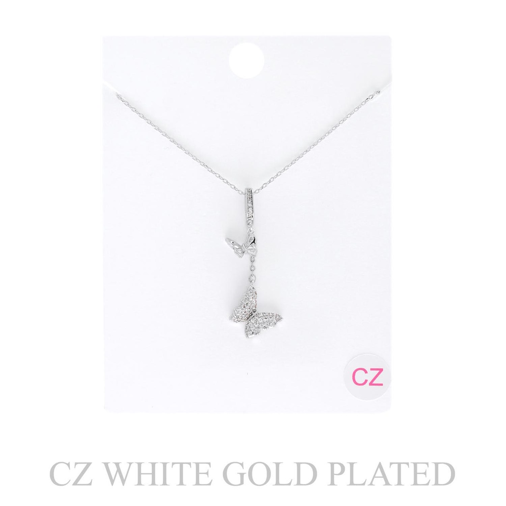 GOLD PLATED CUBIC ZIRCONIA PAVE BUTTERFLY SLIDER PENDANT ADJUSTABLE LARIAT CHAIN NECKLACE IN WHITE GOLD PLATTING