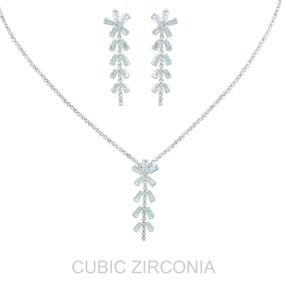 CUBIC ZIRCONIA ADJUSTABLE FLORAL BAGUETTE CUT LARIAT NECKLACE EARRING SET