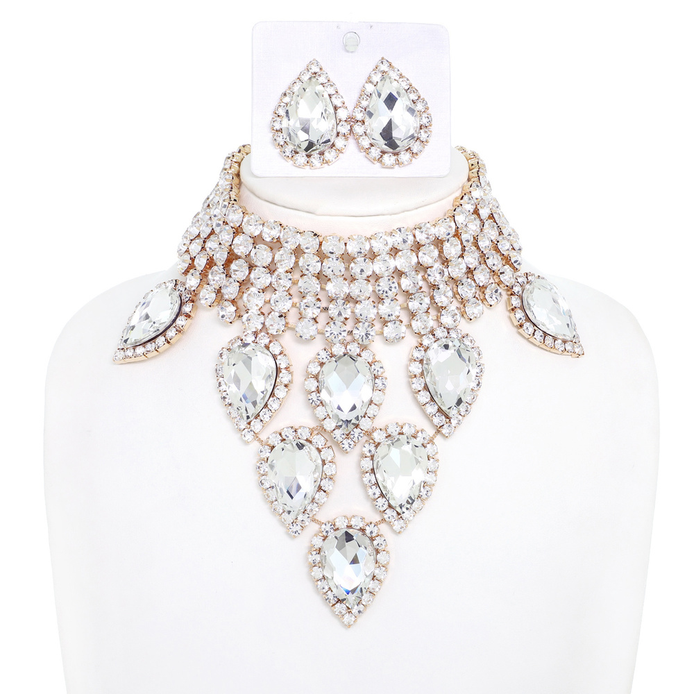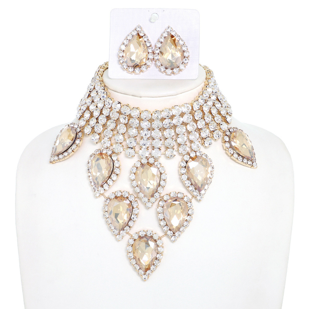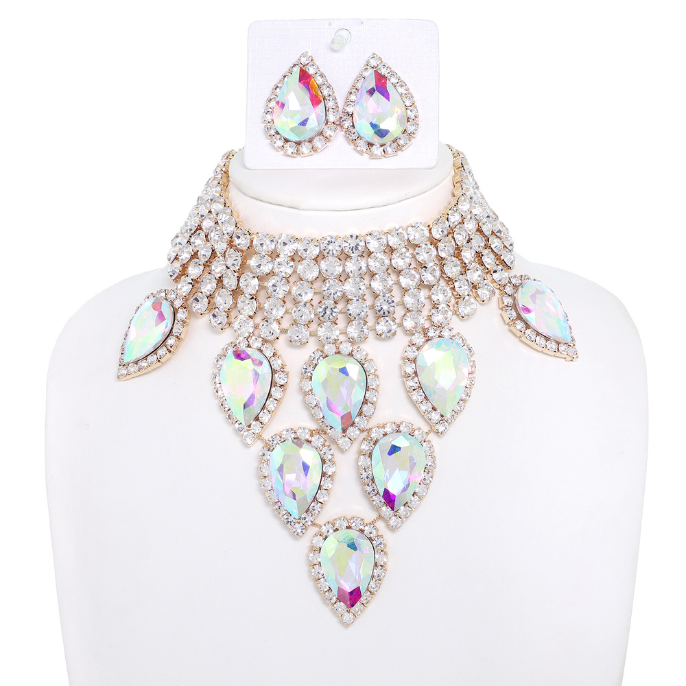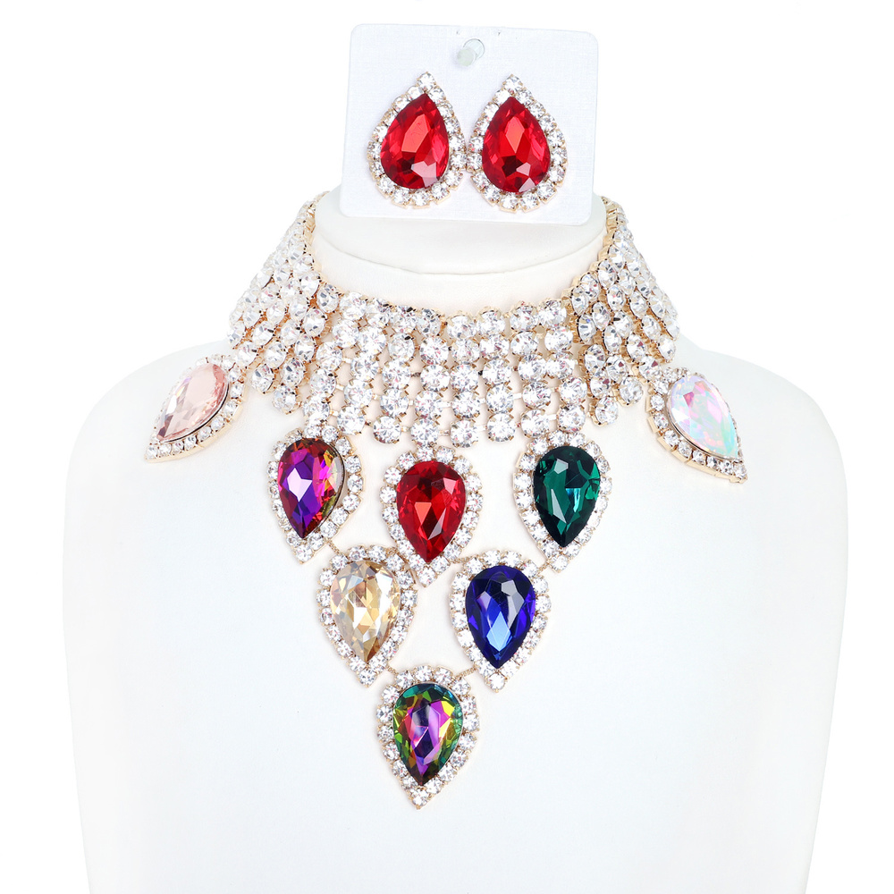 CHRISTMAS LIGHTS TEARDROP CLUSTER CRYSTAL GEMSTONE ADJUSTABLE CHOKER BIB NECKLACE EARRING SET