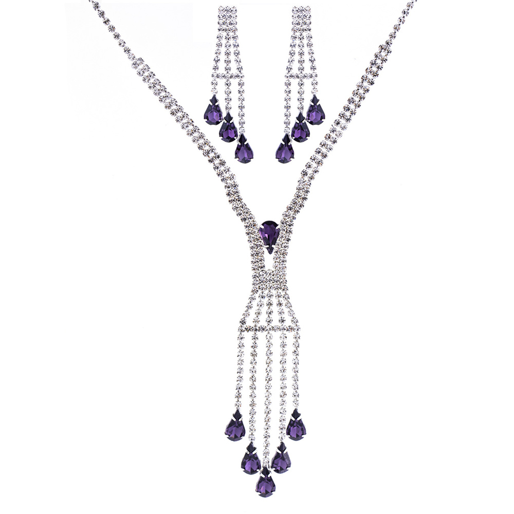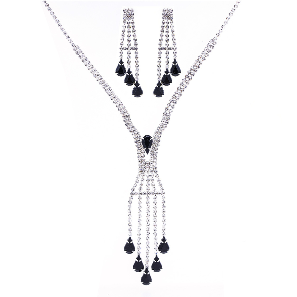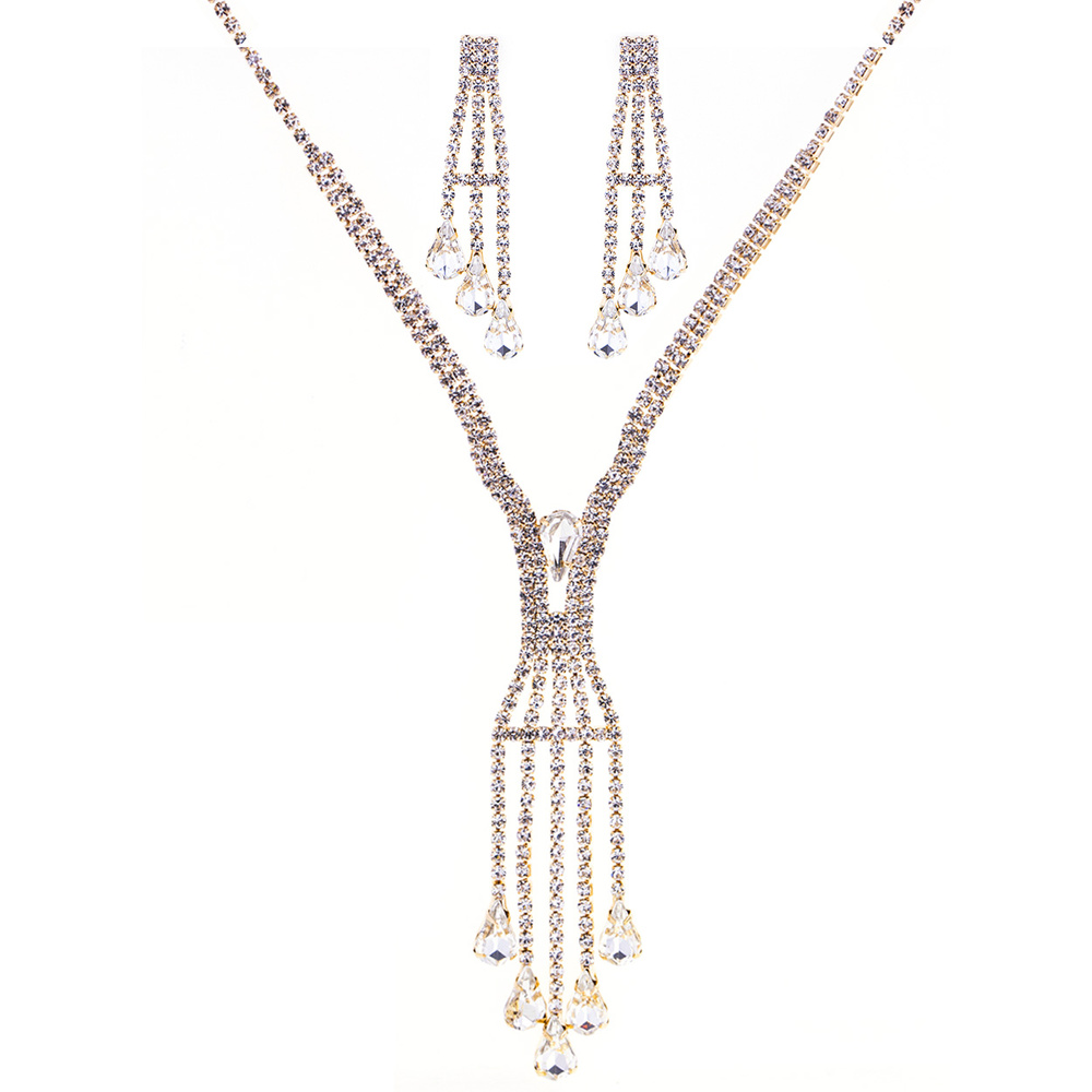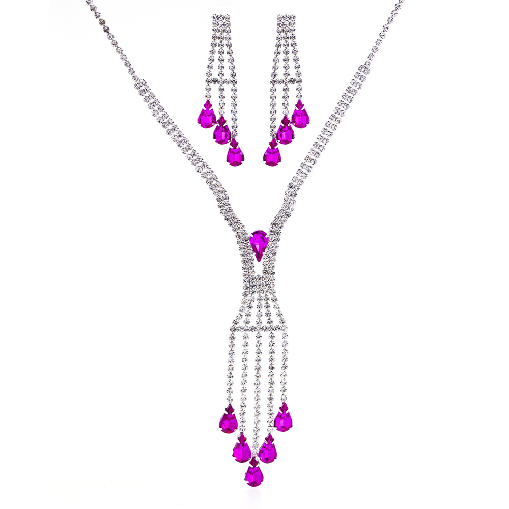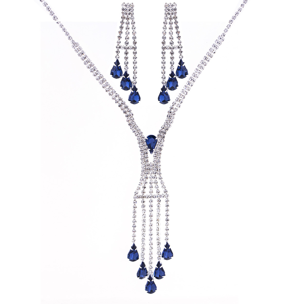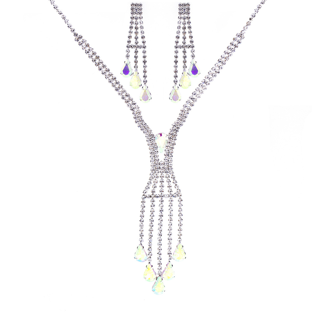 SILVER-TONE RHINESTONE PAVE TEARDROP CRYSTAL CASCADING NECKLACE EARRING SET