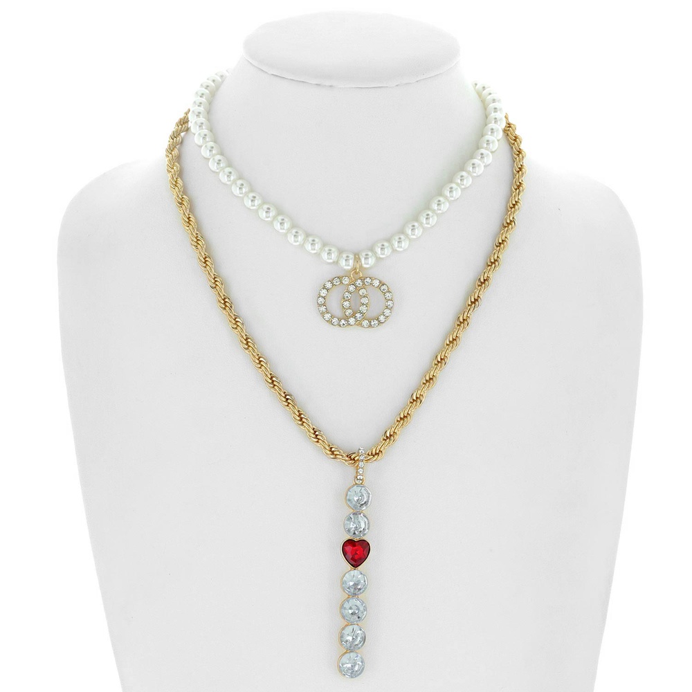 2-row Fashionista Crystal Rhinestone Eternity Link Multistranded Adjustable Layered Look Rope Chain And Pearl Necklace