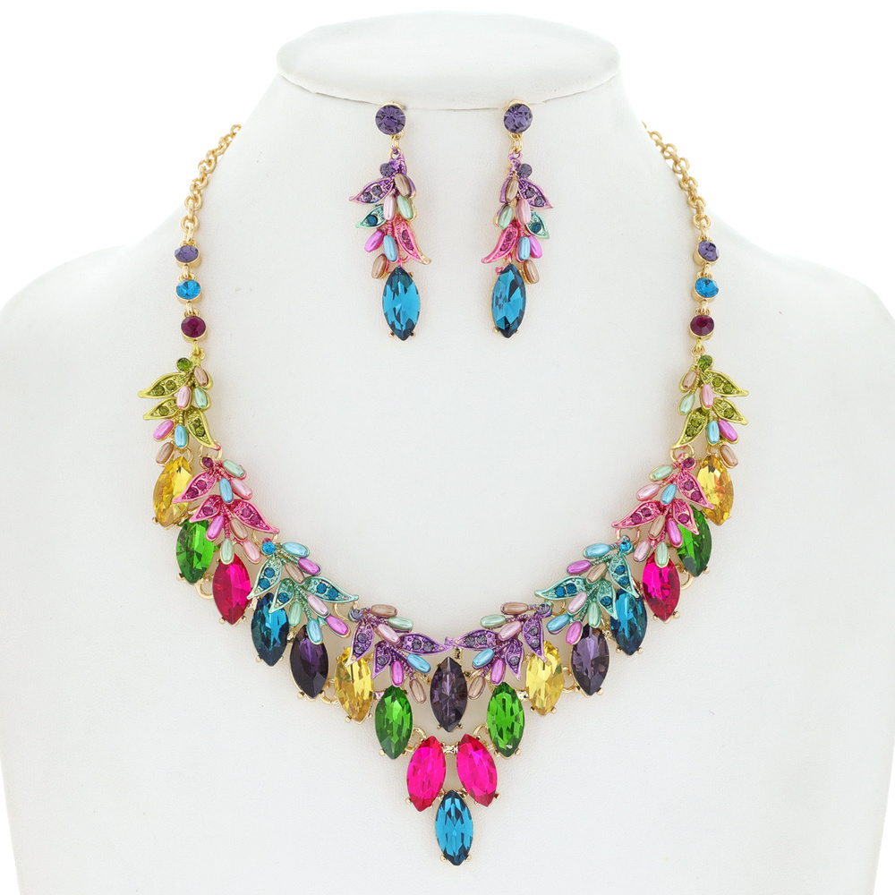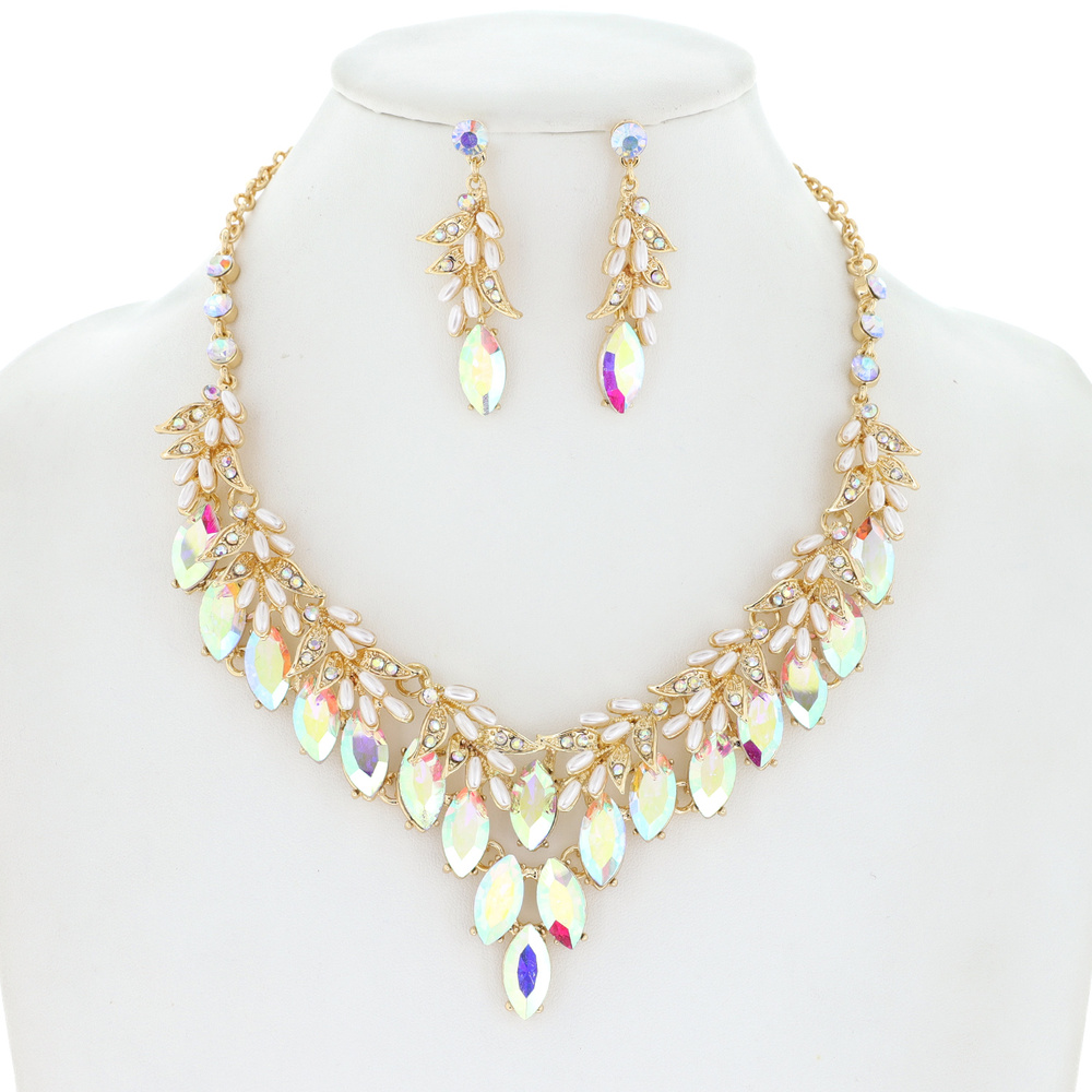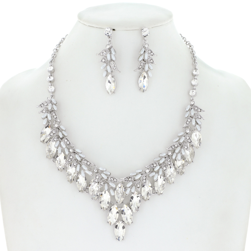 CRYSTAL V-SHAPE VINE LEAF BIB NECKLACE EARRINGS SET