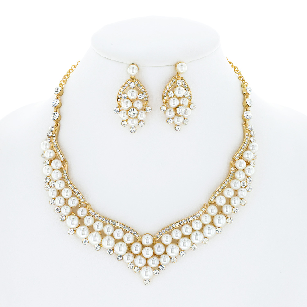 SYNTHETIC PEARL & CRYSTAL RHINESTONE ADJUSTABLE V-SHAPE BIB NECKLACE EARRING SET
