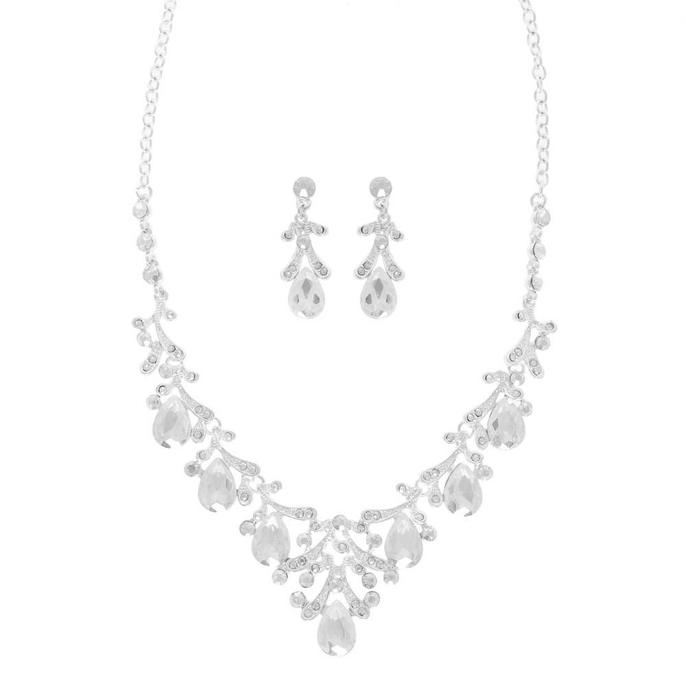 TEAR-DROP CRYSTAL RHINESTONE EMBELLISHED BIB STATEMENT NECKLACE EARRING SET