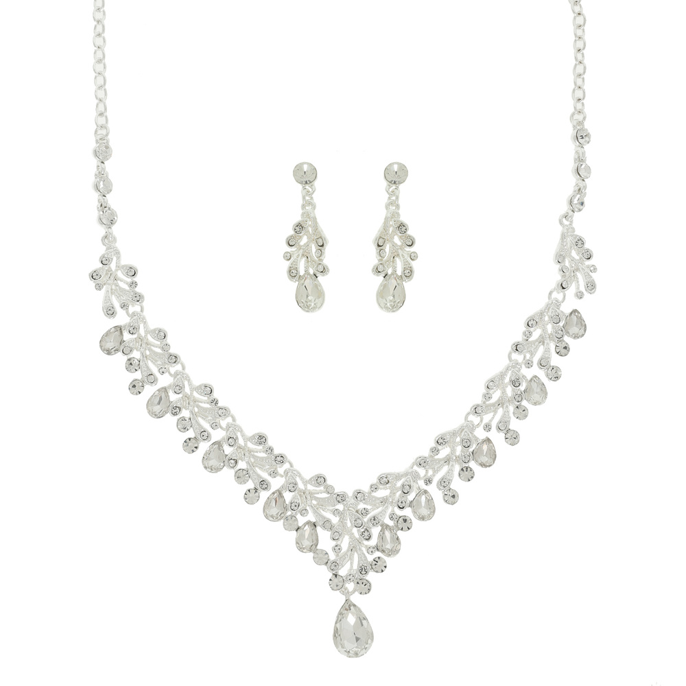 BRIDAL TEAR-DROP CRYSTAL RHINESTONE EMBELLISHED BIB STATEMENT NECKLACE EARRING SET